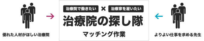治療院の探し隊は「優れた人材を求める治療院」と「よりよい仕事を求める先生」をそれぞれの特徴を考慮しマッチングさせ、多様な要望に適切に応えております。